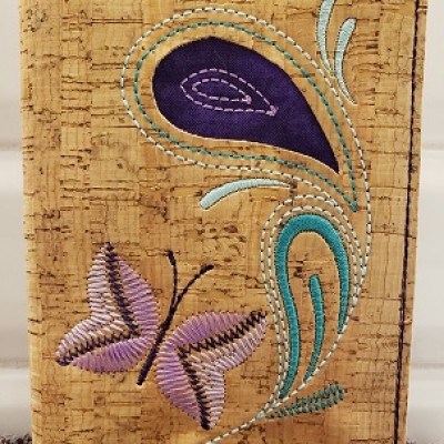 Construct a cork notebook that includes reverse applique on the cover and embroidery on the inside front flap. These notebooks make great gifts for friends or family.