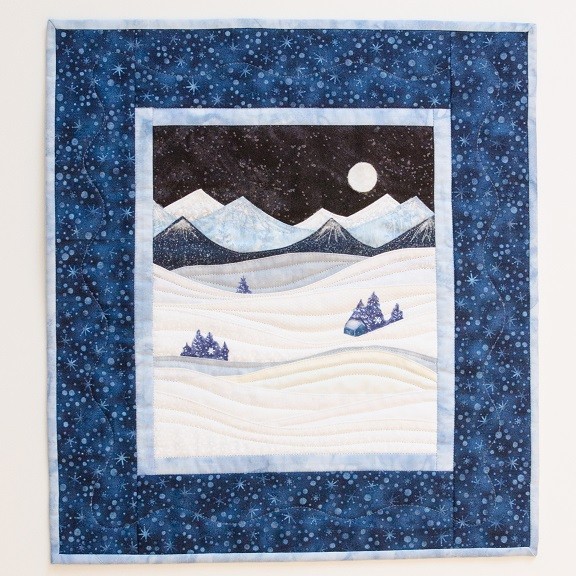 By popular request, Donna will teach another Accidental Landscape project! This scene, Snow at Midnight, follows designer Karen Eckmeier’s technique of curved layering and topstitching, and it features a gorgeous moonlit sky on a snowy winter night. Finished quilt is 15” x 17”.