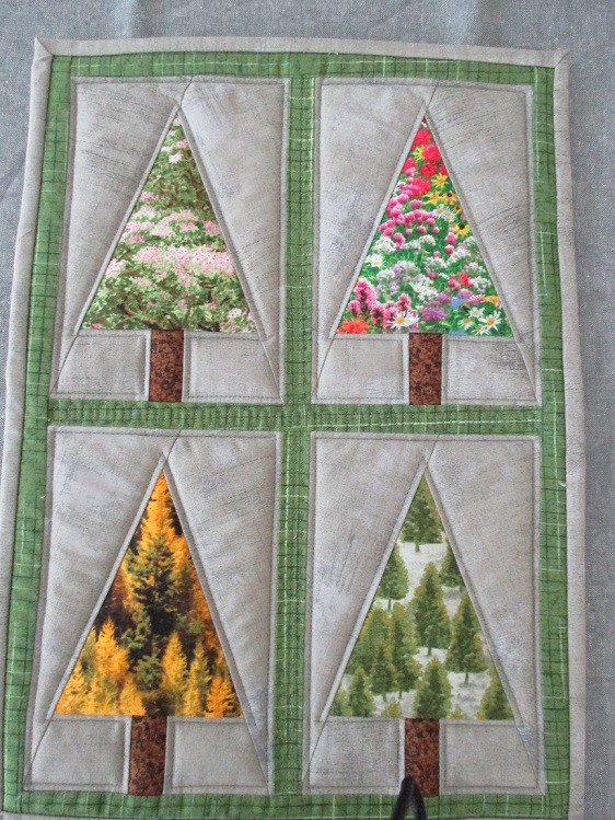 In April, we will make a hot pad big enough to use with your 9" x 13" baking dishes! Piece a tree in the hoop, then sew four tree blocks together, quilt, and bind. You can make one tree for each season, or use holiday fabric!