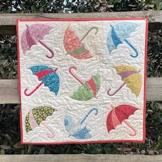 Umbrellas dance cheerfully across this layer-cake friendly project. Master the technique of finished edge appliqué using fusible web to create a new Spring quilt or wall hanging.