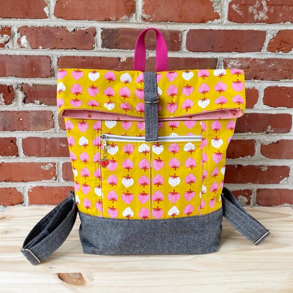 This advanced beginner-friendly bagmaking pattern is a great way to make a useful and in-style backpack. The foldover top and closure keep things secure, while the front zippered pocket keeps essentials within easy reach. Adjustable straps make it wearable in any season. This pattern is very conducive to multiple kinds of fabrics such as quilting cotton, linen, canvas, waxed canvas and cork. There are endless possibilities for customizing this backpack to your style and favorite fabric.
