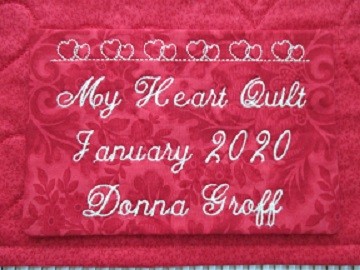 In class we will bring a decorative stitch from machine to embroidery, and learn about size and density of letters. Then you will create your own unique quilt label in your machine and embroider it "In-the-hoop". Create one for your Heart or Whale quilt you made in class beginning of February 2020 or for another quilt in the works.