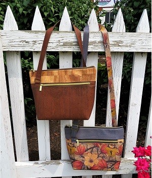 Create your own distinctive two-color cork purse and fall in love with cork! The outside zipper pockets are a design feature that is useful. You’ll stay organized with the 6 additional inside pockets. The large finished purse is 12” W x 9”H x 4” D at the base. The small finished purse is 11” W x 8”H x 3” deep. You have the option of a shoulder or a cross-body strap.