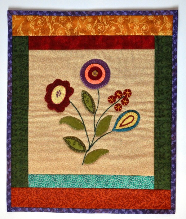In this floral design there are combinations of wool and cotton applique shapes embellished with various embroidery stitches. Mary Jane will teach you these stitches as well as multiple ways to prepare cotton shapes for applique and how to work with wool.