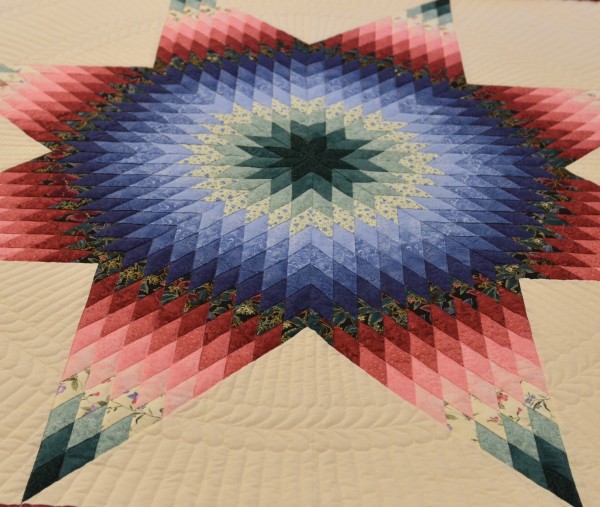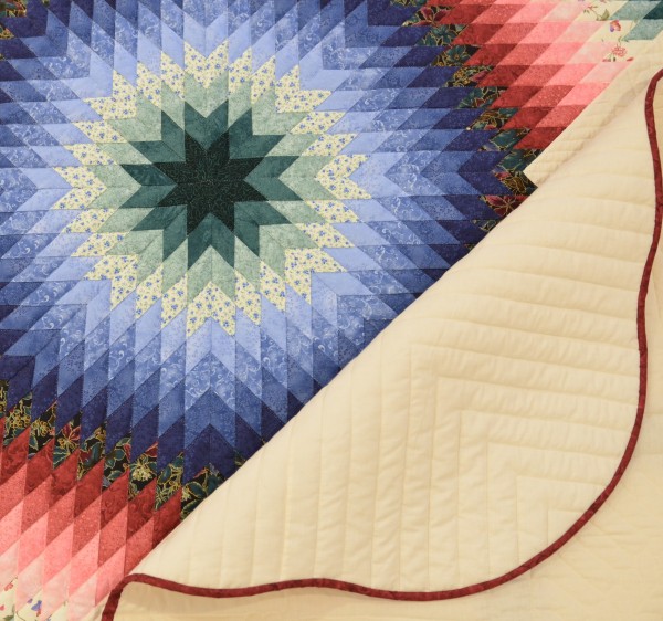 The Lone Star is a classic pattern that appeals to many buyers! It requires careful piecing for the diamonds to align perfectly and the center of the quilt to lay flat.