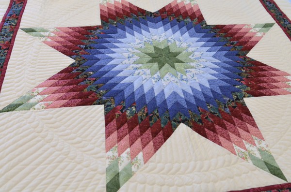 The Lone Star is a classic pattern that appeals to many buyers! It requires careful piecing for the diamonds to align perfectly and the center of the quilt to lay flat.