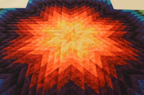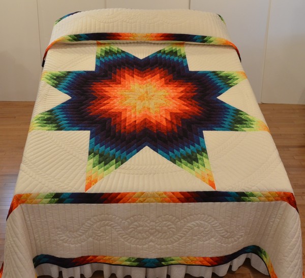 The Lone Star is a classic pattern that appeals to many buyers! It requires careful piecing for the diamonds to align perfectly and the center of the quilt to lay flat.