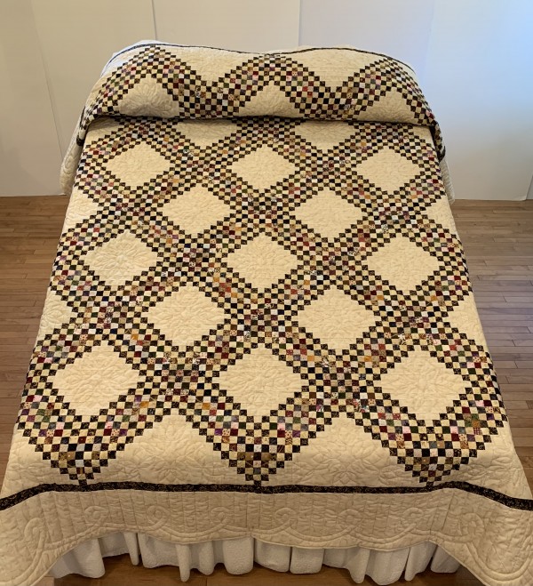 A combination of two beloved patterns, thousands of small postage stamp-sized pieces all work together in this Irish Chain design known for its simplicity and airy quality! The quilt-maker's artful placement of color creates a visually pleasing design.