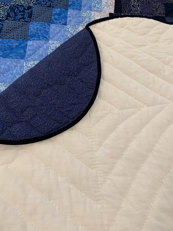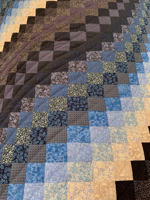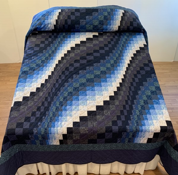 The more than 2,000 blocks are hand-quilted across the diagonal, enhancing the movement of the piece.