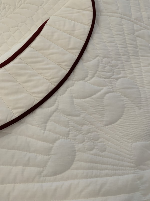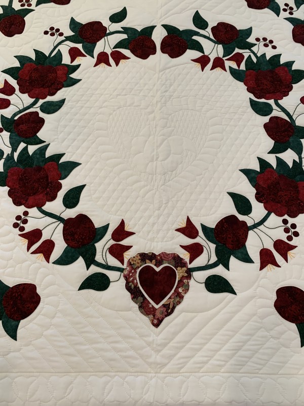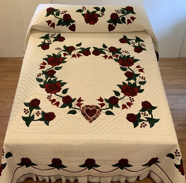 A beautiful romantic quilt design, the Heart of Roses quilt features hand-appliqued roses, leaves and berries in a pleasing heart-shaped arrangement. The quilting in this design is always extensive, especially in the center of the heart. Hand-quilted by a friend, Lancaster County, PA.