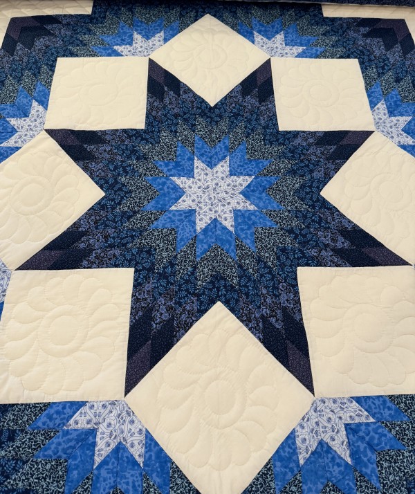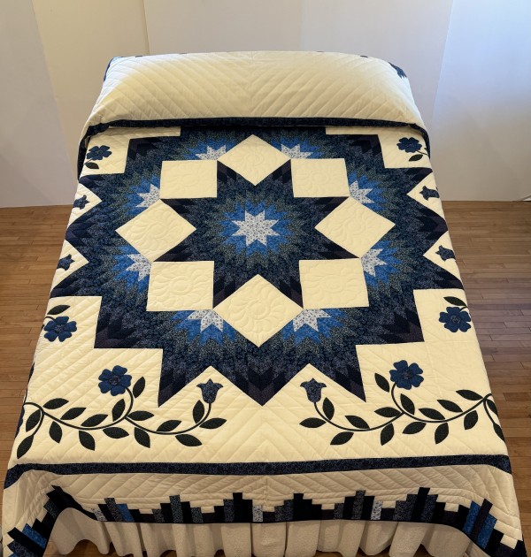 The star seems to have a 3-dimensional quality to it just because of the placement of the colors. Set against the ivory background, the star sings! We love this variation of the Lone Star pattern. Additionally, this quilt features appliqued flowers surrounding the star. Stunning!