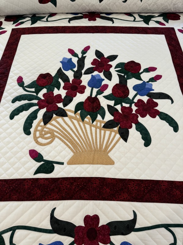 This hand-appliqued quilt is stunning! The contrast of the hand-dyed batik fabrics in the flower basket against the black background makes it a show-stopper!