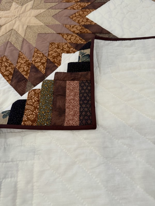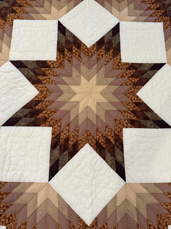 Take note, first, of the stunning arrangement of color in this breath-taking quilt! The star seems to have a 3-dimensional quality to it just because of the placement of the colors. Set against the ivory background, the star sings! We love this variation of the Lone Star pattern. Additionally, this quilt features appliqued flowers surrounding the star. Stunning! Hand-quilted by a friend, Lancaster County, PA.