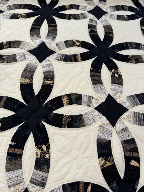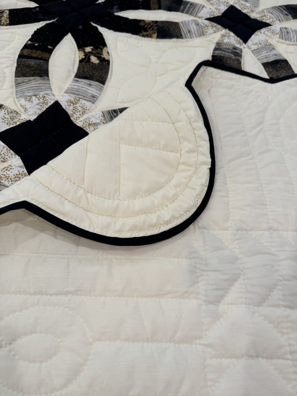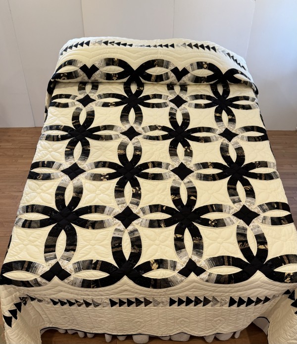 The intertwining circles created from curved pieces of fabric require a skilled seamstress, and the intricate hand-quilting exemplifies outstanding workmanship.