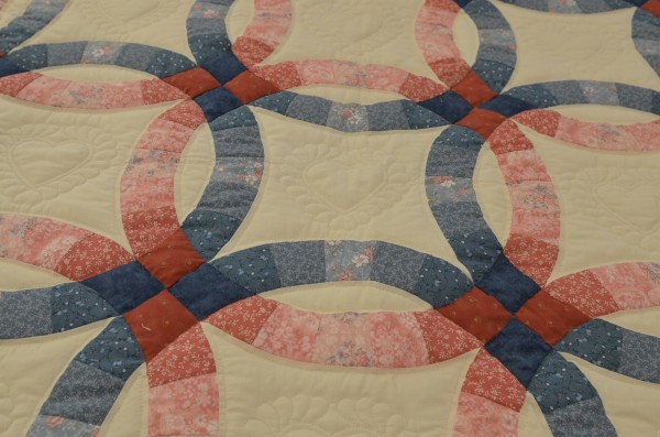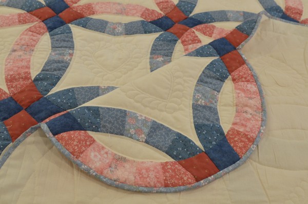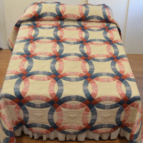 The intertwining circles created from curved pieces of fabric require a skilled seamstress, and the intricate hand-quilting exemplifies outstanding workmanship.