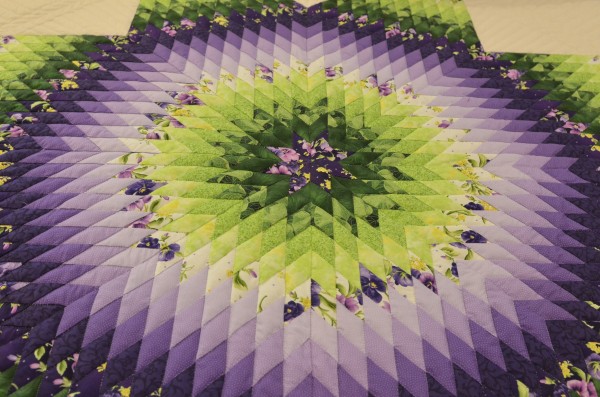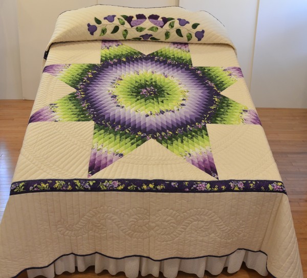 The Lone Star is a classic pattern that appeals to many buyers! It requires careful piecing for the diamonds to align perfectly and the center of the quilt to lay flat.