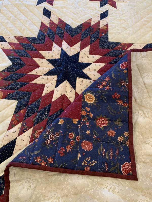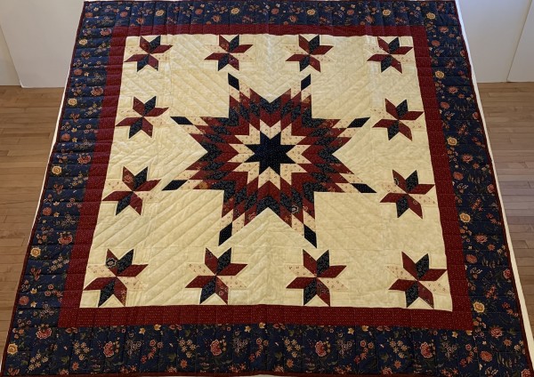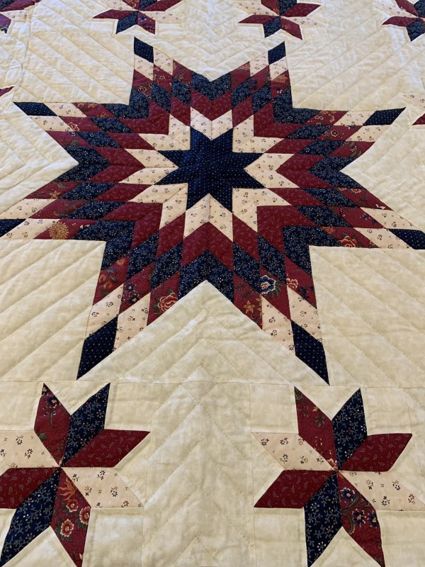 The Lone Star is a classic pattern that appeals to many buyers! It requires careful piecing for the diamonds to align perfectly and the center of the quilt to lay flat.