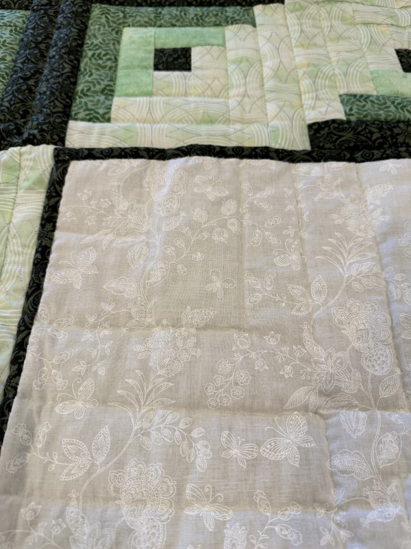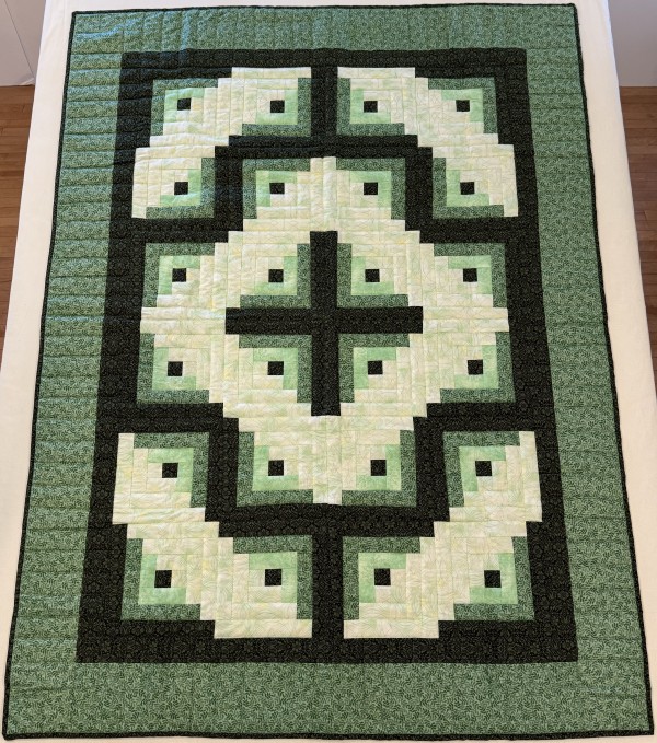Traditionally, the center of the “cabin” features a red block for the fire or hearth, the gathering place of any home. Each "log" is accented with hand-quilting giving the quilt added loft and beauty.