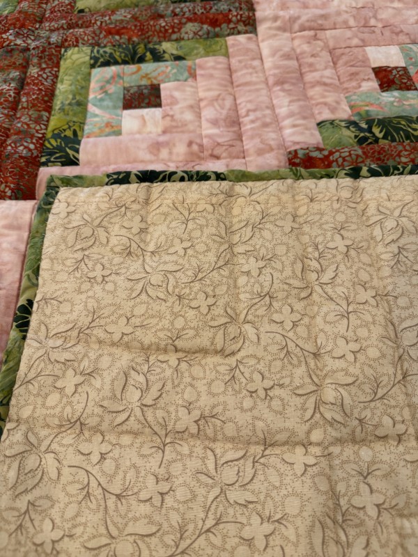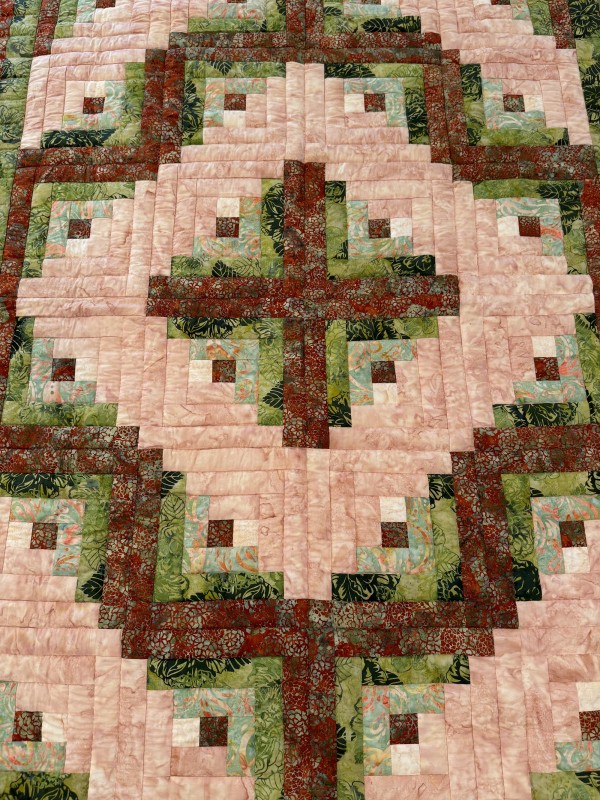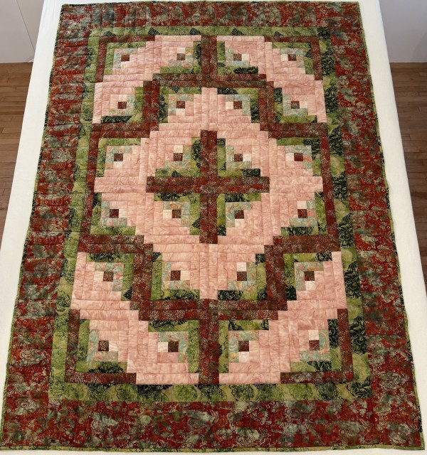 Traditionally, the center of the “cabin” features a red block for the fire or hearth, the gathering place of any home. Each "log" is accented with hand-quilting giving the quilt added loft and beauty.