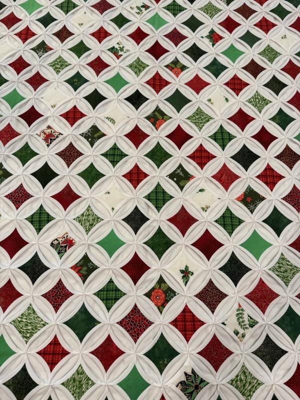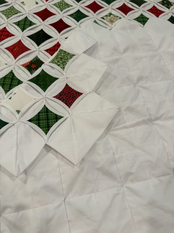 The Cathedral Window pattern is a very old one that’s quite labor-intensive. Each colored panel in this quilt has been hand-sewn in place and carefully arranged in a precise pattern. While there's no batting filler between the layers, the 30-plus yards of muslin fabric add substantial weight and body to the quilt. Notice the saw-tooth edge around all four sides of the quilt. Hand-sewn by a friend, Lancaster County, PA.