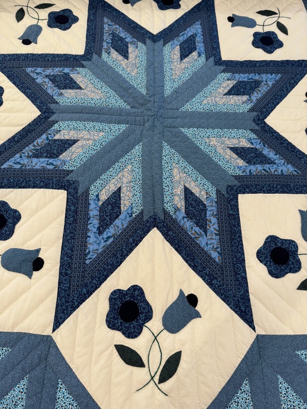 The star seems to have a 3-dimensional quality to it just because of the placement of the colors. Set against the ivory background, the star sings! We love this variation of the Lone Star pattern. Additionally, this quilt features appliqued flowers surrounding the star. Stunning!