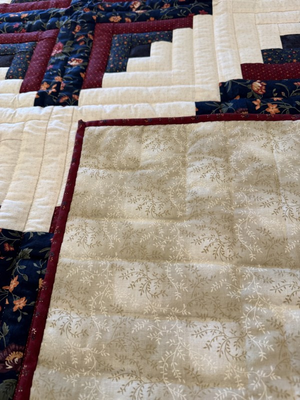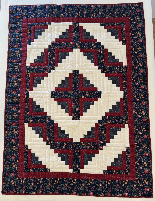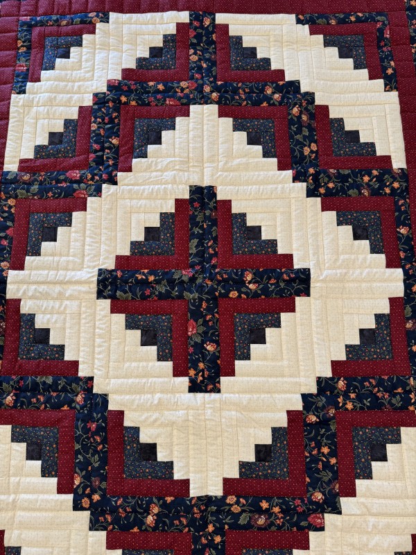 Traditionally, the center of the “cabin” features a red block for the fire or hearth, the gathering place of any home. Each "log" is accented with hand-quilting giving the quilt added loft and beauty.