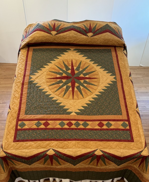 The bed skirt portion features Compass points and is a stunning accent to the overall design. The workmanship required to make this quilt is not for a beginner!