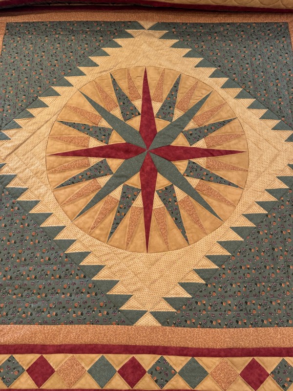 A stunning Mariner's Compass Star creates a center medallion of this handsome quilt. Various borders, including a saw-tooth one flank the central star.