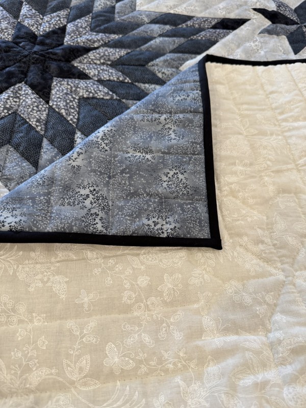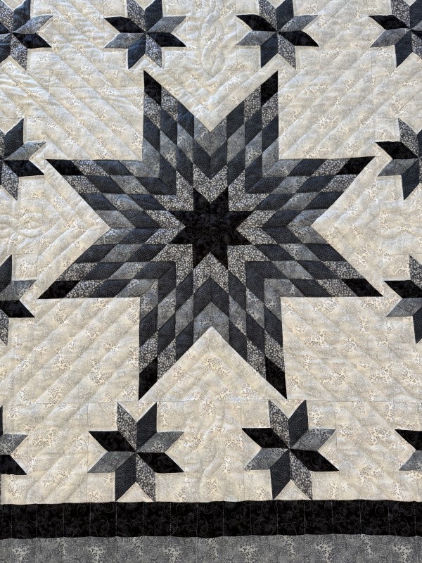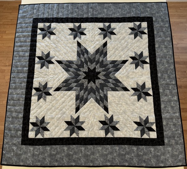 The Lone Star is a classic pattern that appeals to many buyers! It requires careful piecing for the diamonds to align perfectly and the center of the quilt to lay flat.