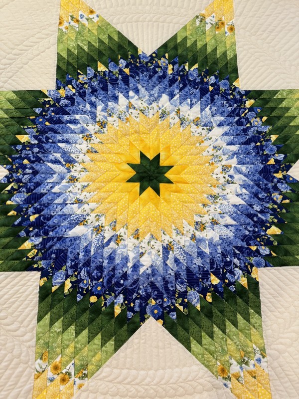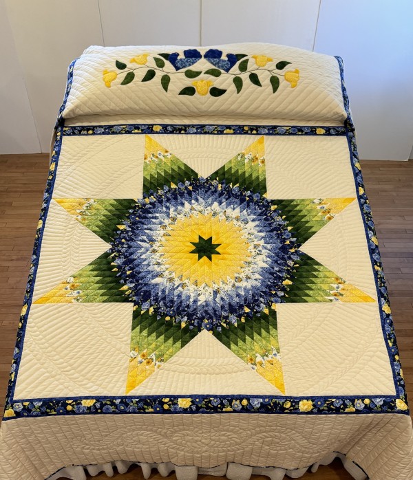 The Lone Star is a classic pattern that appeals to many buyers! It requires careful piecing for the diamonds to align perfectly and the center of the quilt to lay flat.