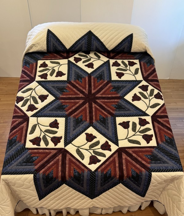 Take note, first, of the stunning arrangement of color in this breath-taking quilt! The star seems to have a 3-dimensional quality to it just because of the placement of the colors. Set against the ivory background, the star sings! We love this variation of the Lone Star pattern. Additionally, this quilt features appliqued flowers surrounding the star. Stunning! Hand-quilted by a friend, Lancaster County, PA