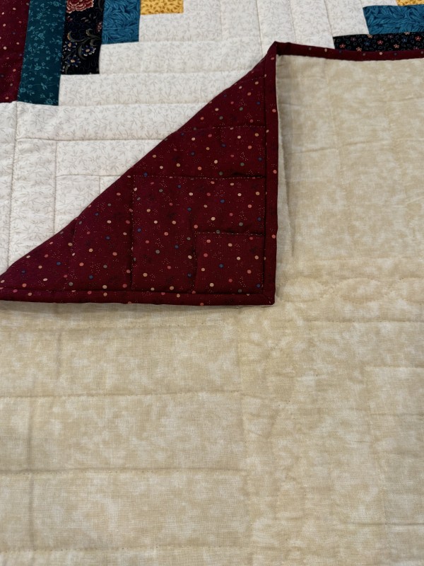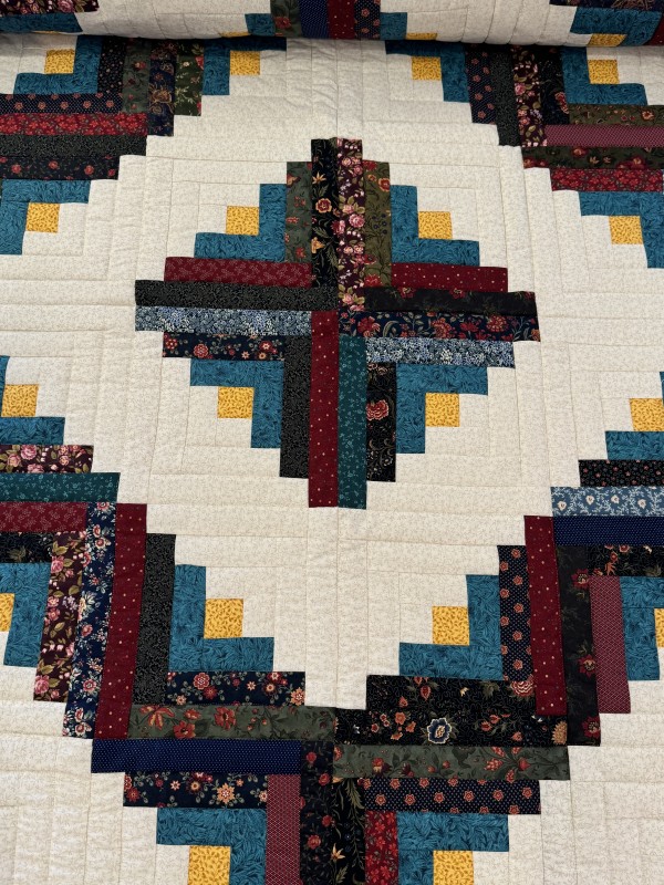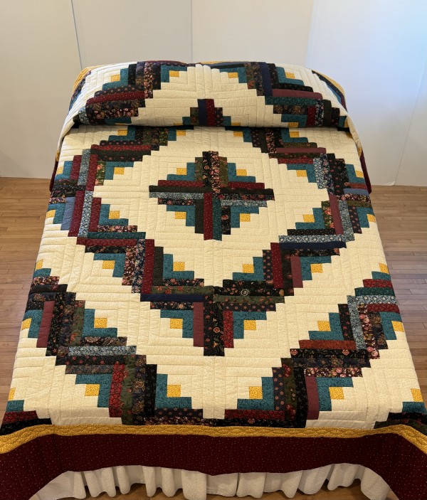 Traditionally, the center of the “cabin” features a red block for the fire or hearth, the gathering place of any home. Each "log" is accented with hand-quilting giving the quilt added loft and beauty.