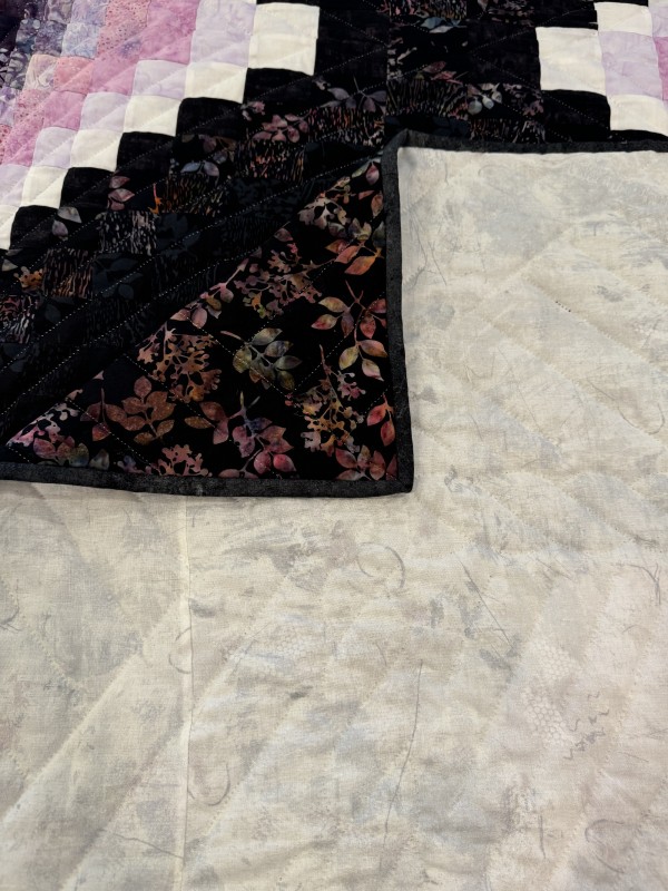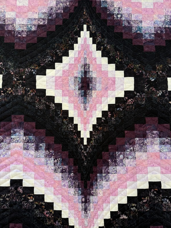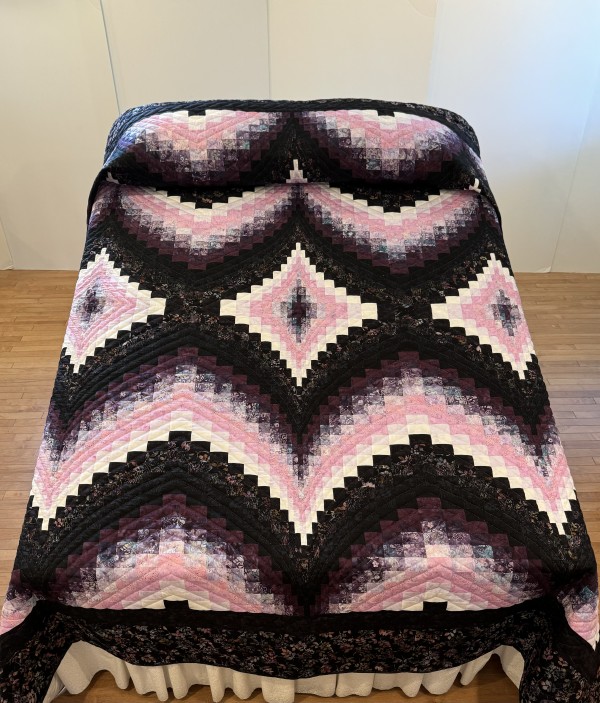Wow, what an interesting variation of the Bargello pattern! This is definitely the work of an experienced quilter who has great organizational skills! The shifting color values bring energy and excitement. Hand-quilting from corner-to-corner of each block enhances the design. Hand-quilted by a Mennonite friend.