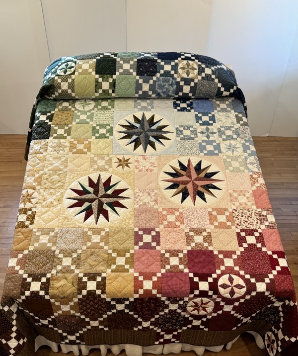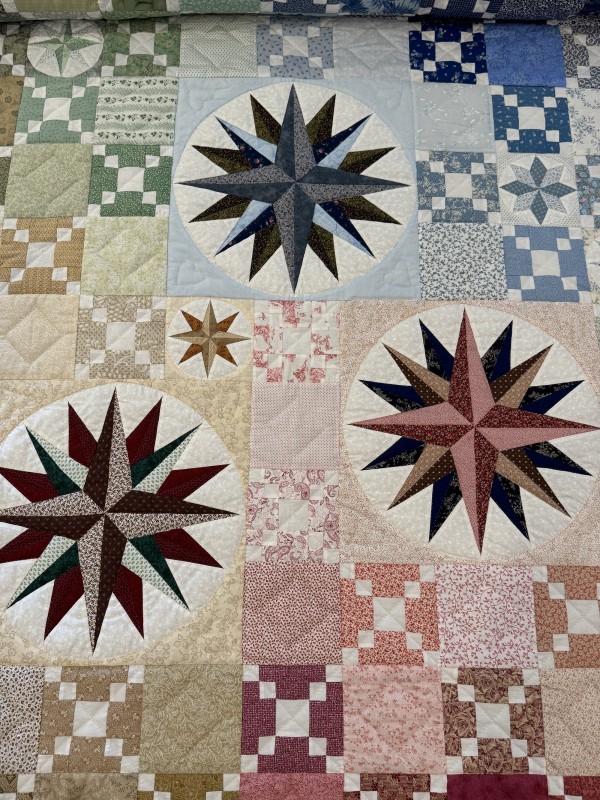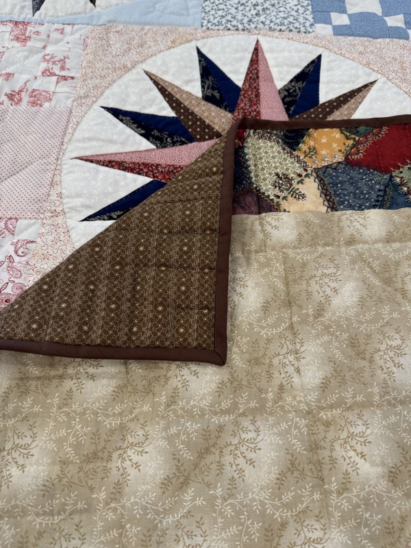 The color placement in this quilt makes the pattern shine! It almost has a watercolor effect. This quilter has an expert eye for color value! Hand-quilted by a Mennonite friend.