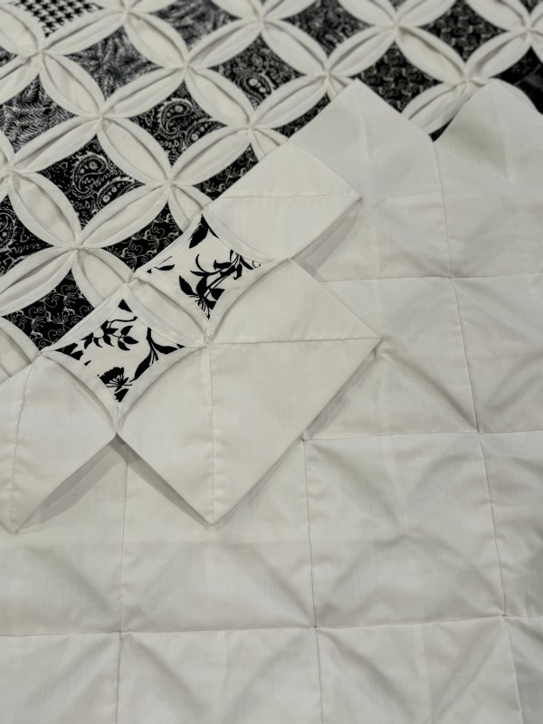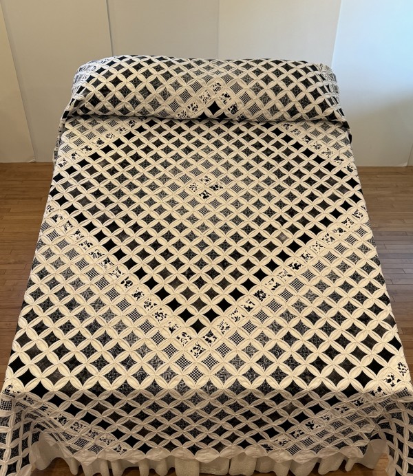 The Cathedral Window pattern is a very old one that’s quite labor-intensive. Each colored panel in this quilt has been hand-sewn in place and carefully arranged in a precise pattern. While there's no batting filler between the layers, the 30-plus yards of muslin fabric add substantial weight and body to the quilt. Notice the saw-tooth edge around all four sides of the quilt. Please note, this quilt fits nicely on both a King- and Queen-size bed. Hand-sewn by a friend, Lancaster County, PA.