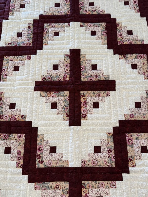 The Log Cabin block pattern is the oldest of quilt designs, and perhaps the most beloved, as it’s often chosen as a family heirloom. Traditionally, the center of the “cabin” features a red block for the fire or hearth, the gathering place of any home. Each "log" is accented with hand-quilting giving the quilt added loft and beauty. Hand-quilted by an Amish friend.