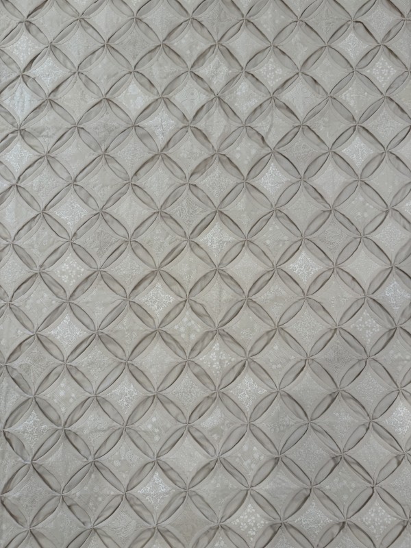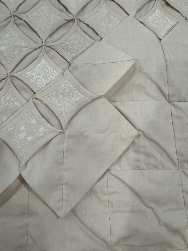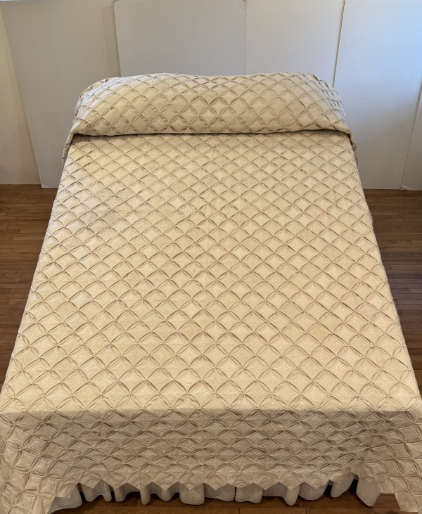 The Cathedral Window pattern is a very old one that’s quite labor-intensive. Each colored panel in this quilt has been hand-sewn in place and carefully arranged in a precise pattern. While there's no batting filler between the layers, the 30-plus yards of muslin fabric add substantial weight and body to the quilt. Notice the saw-tooth edge around all four sides of the quilt. Please note, this quilt fits nicely on both a King- and Queen-size bed. Hand-sewn by a friend, Lancaster County, PA.