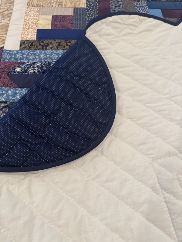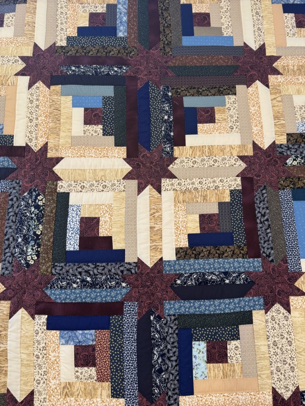 A popular variation of the traditional Log Cabin quilt pattern, this quilt boasts eight-pointed stars at the block intersections. Generally made to feature two color-ways, the Colorado Star is a handsome design that is admired by many. Hand-quilted by a friend, Lancaster County, PA.