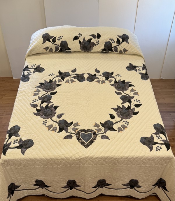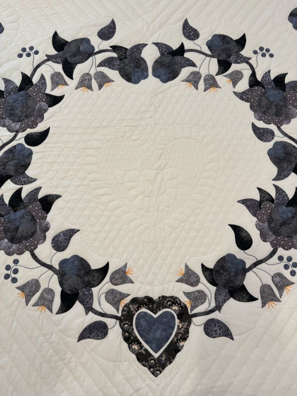 A beautiful romantic quilt design, the Heart of Roses quilt features hand-appliqued roses, leaves and berries in a pleasing heart-shaped arrangement. The quilting in this design is always extensive, especially in the center of the heart.