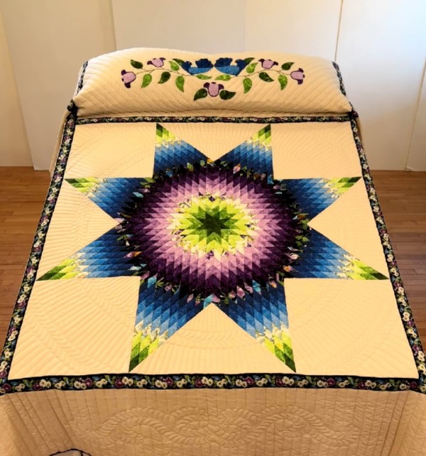 The Lone Star is a classic pattern that appeals to many buyers! It requires careful piecing for the diamonds to align perfectly and the center of the quilt to lay flat. This Lone Star features a hand-appliqued design that falls nicely on top of the pillows. Hand-quilted by an Amish friend, Lancaster County, PA Please note, the Bed View photo appears to have a yellow background however, it is really cream/ivory. Please refer to Close Up and Border/Backing photos for more true color.
