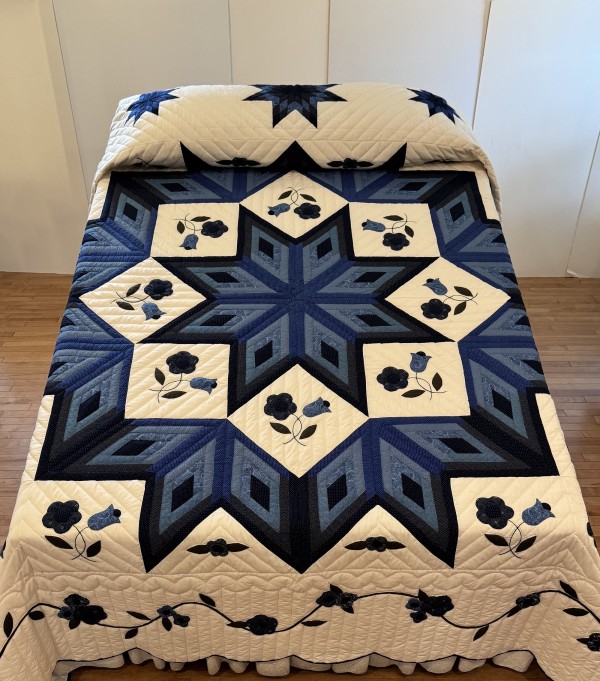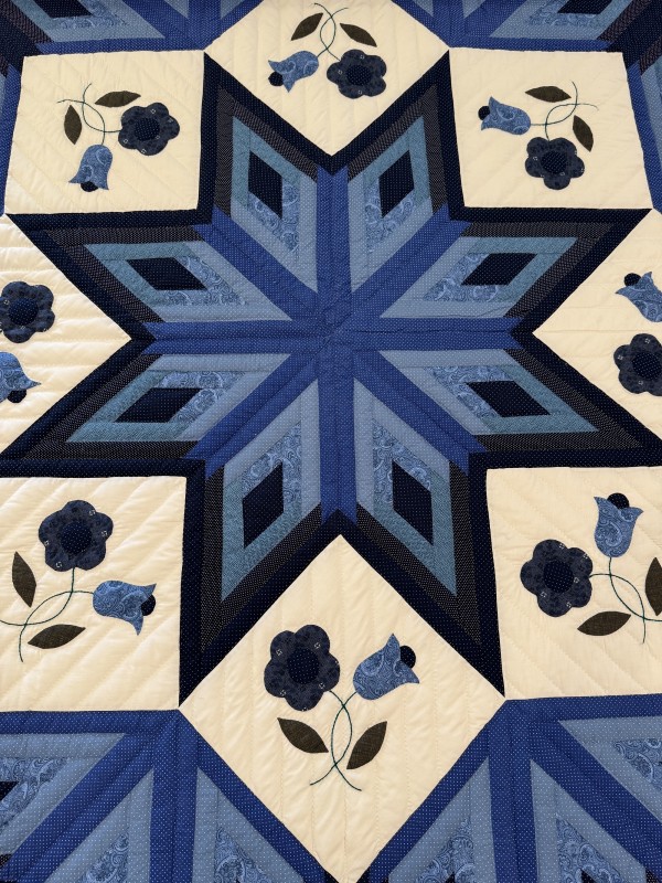 The star seems to have a 3-dimensional quality to it just because of the placement of the colors. Set against the ivory background, the star sings! We love this variation of the Lone Star pattern. Additionally, this quilt features appliqued flowers surrounding the star. Stunning!
