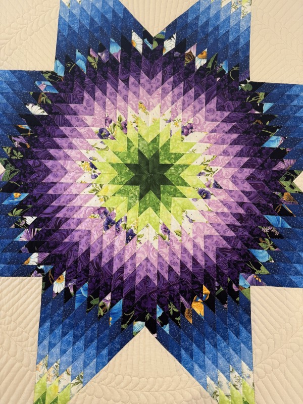 The Lone Star is a classic pattern that appeals to many buyers! It requires careful piecing for the diamonds to align perfectly and the center of the quilt to lay flat. This Lone Star features a hand-appliqued design that falls nicely on top of the pillows. Hand-quilted by an Amish friend, Lancaster County, PA Please note, the Bed View photo appears to have a yellow background however, it is really cream/ivory. Please refer to Close Up and Border/Backing photos for more true color.