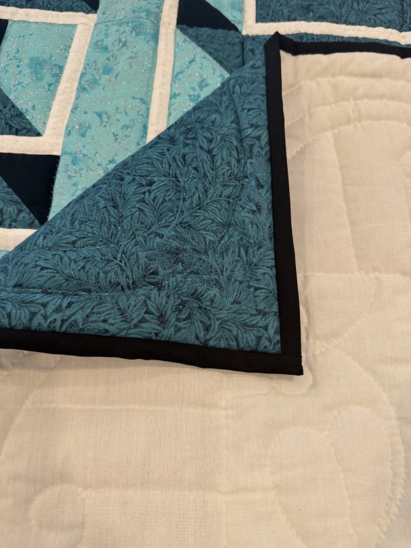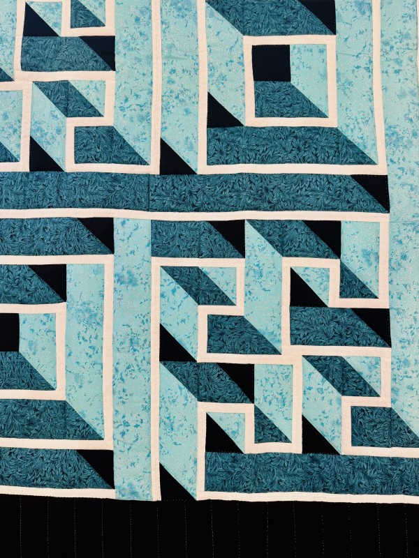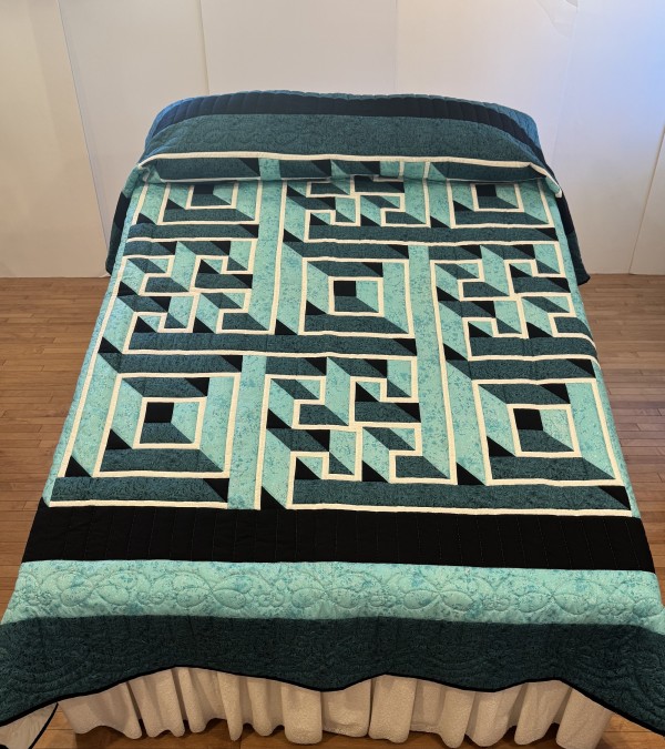 A two-block wonder for its understated simplicity (basically just two blocks) and its outstanding dimension! Few quilts have this amazing 3D effect, achieved largely by color value and placement. Hand-quilted by a Mennonite friend, Lancaster County, PA.