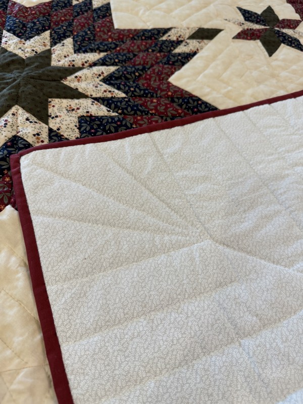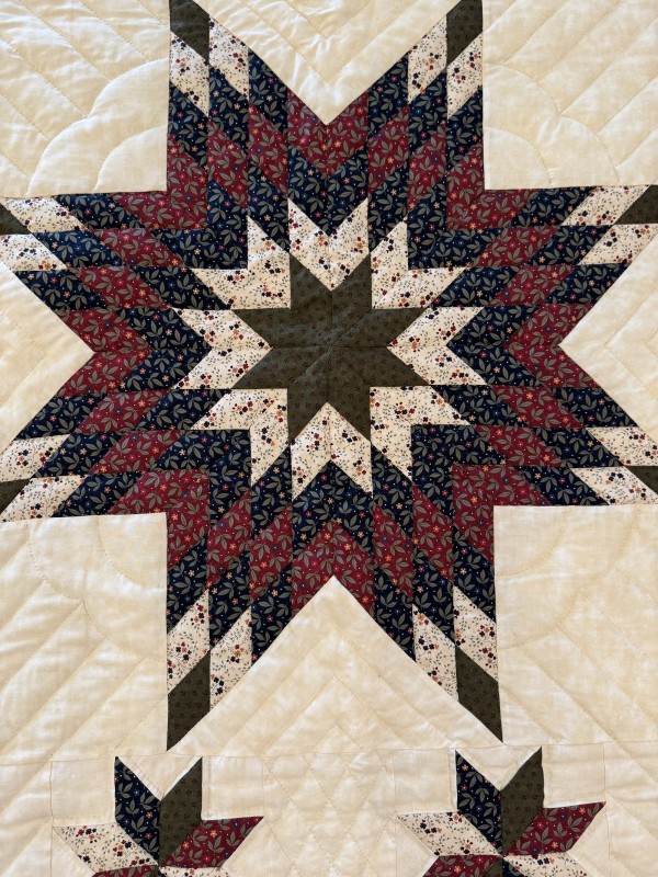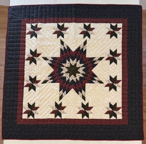The Lone Star is a classic pattern that appeals to many buyers! It requires careful piecing for the diamonds to align perfectly and the center of the quilt to lay flat. A throw-size quilt is the perfect addition to any room of your home! Hand-quilted by an Amish friend, Lancaster County, PA.
