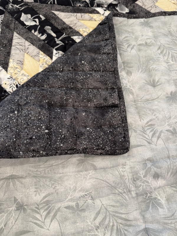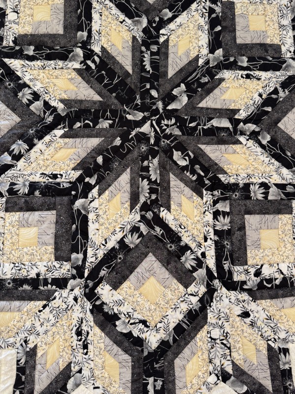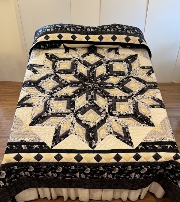This quilt puts a beautiful twist on the traditional Log Cabin block! The center star creates beautiful focal point. The surrounding Log Cabin blocks frame the medallion and radiate crisply out from the center. This quilt is the work of an expert piecer! Hand-quilted by a Mennonite friend, Lancaster County, PA.