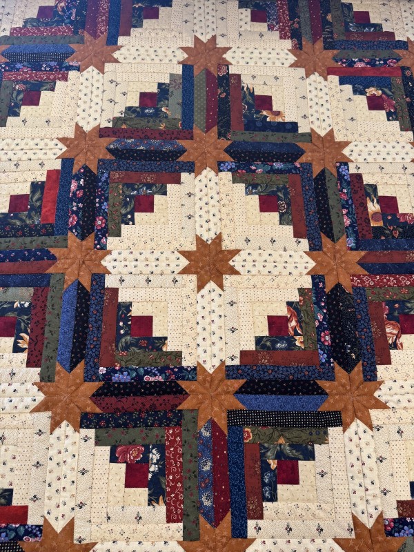 A popular variation of the traditional Log Cabin quilt pattern, this quilt boasts eight-pointed stars at the block intersections.