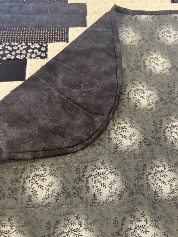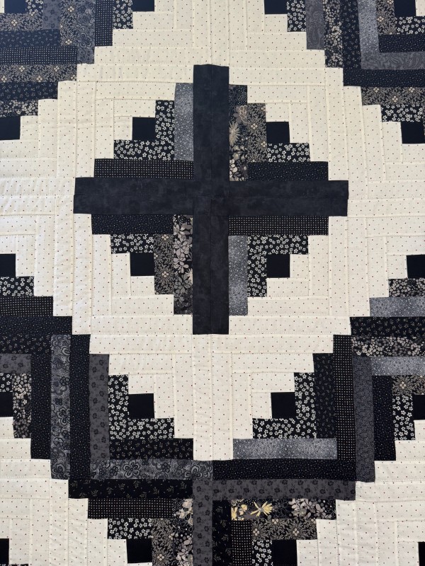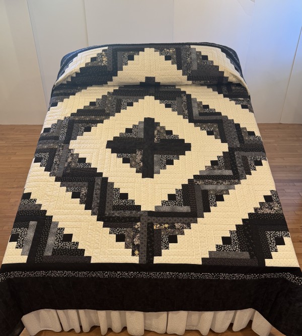 The Log Cabin block pattern is the oldest of quilt designs, and perhaps the most beloved, as it’s often chosen as a family heirloom. Traditionally, the center of the “cabin” features a red block for the fire or hearth, the gathering place of any home. Each "log" is accented with hand-quilting giving the quilt added loft and beauty. Hand-quilted by a friend, Lancaster County, PA.