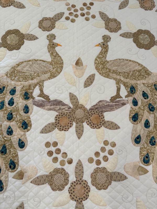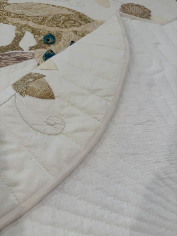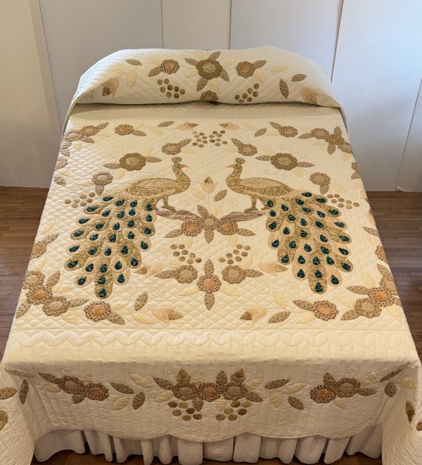 Wow, what a work of art! The Peacock is an exceptional example of hand-applique design. From the tail feathers to the bunches of berries, each piece was hand-sewn in place. Notice the extra applique on the borders and pillow portion of the quilt. A close up inspection also reveals the hand-embroidered detail of the vines and tendrils. Hand-quilted by a friend, Lancaster County, PA