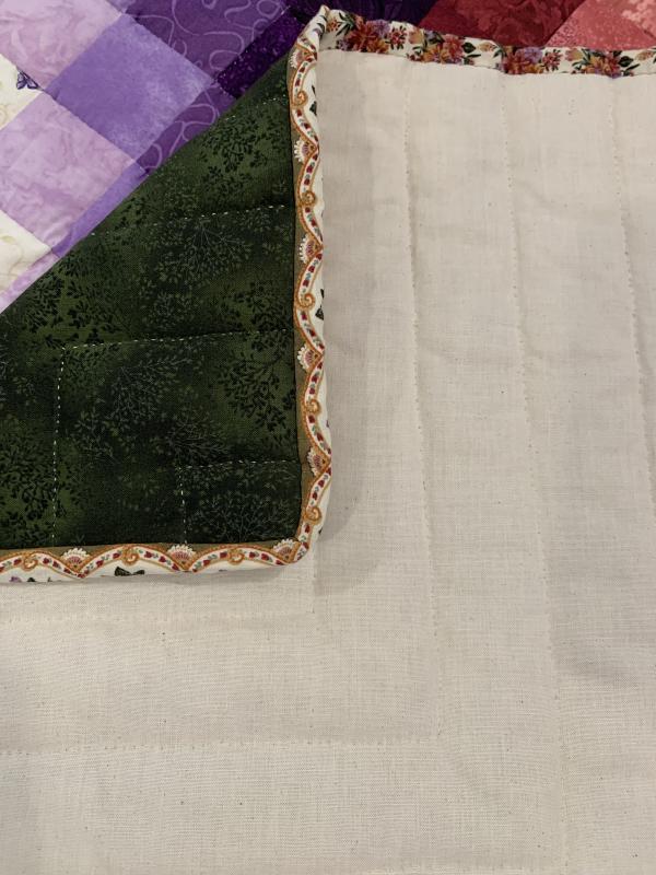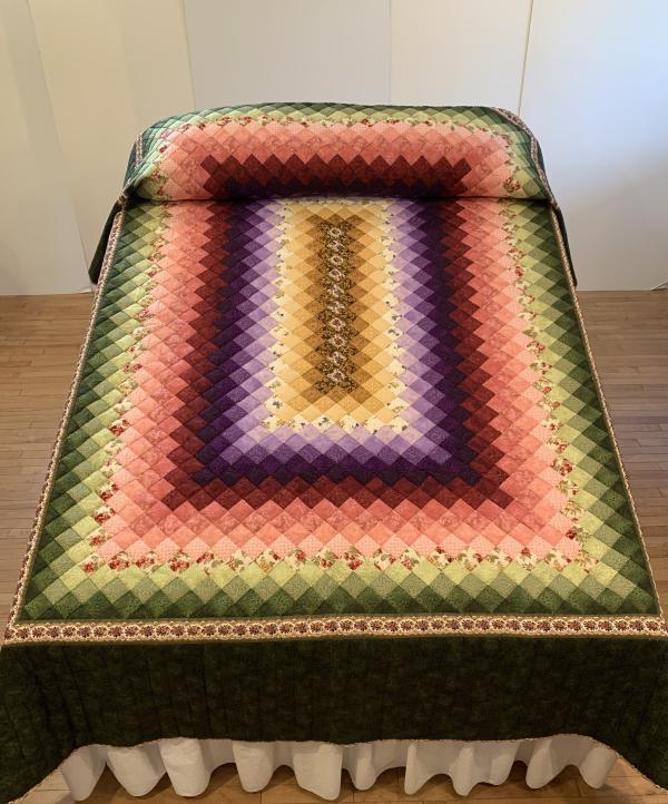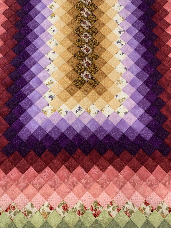 Sunshine and shadow describes perfectly the way these light and dark colors play off each other. A traditional pattern, this quilt would be at home in any style décor. We think it's timeless. Take note of the extension hand-quilting on the outer border. Hand-quilted by an Amish friend, Lancaster County, PA.