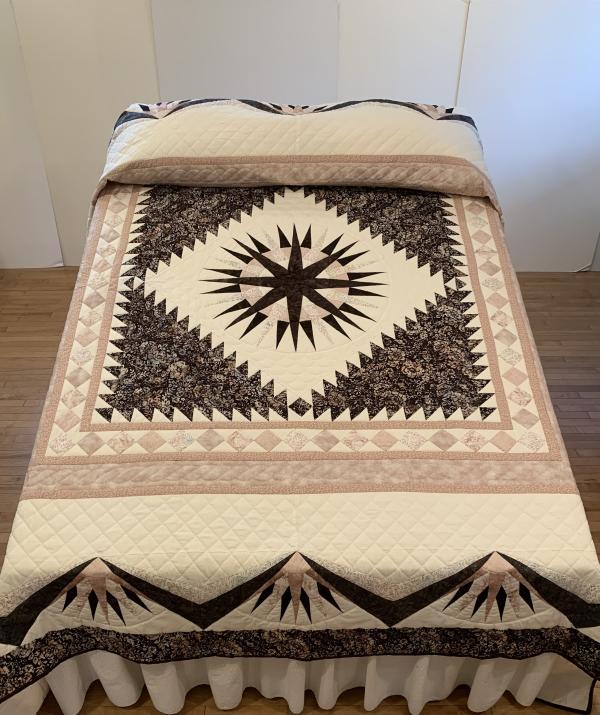 The bed skirt portion features Compass points and is a stunning accent to the overall design. The workmanship required to make this quilt is not for a beginner!
